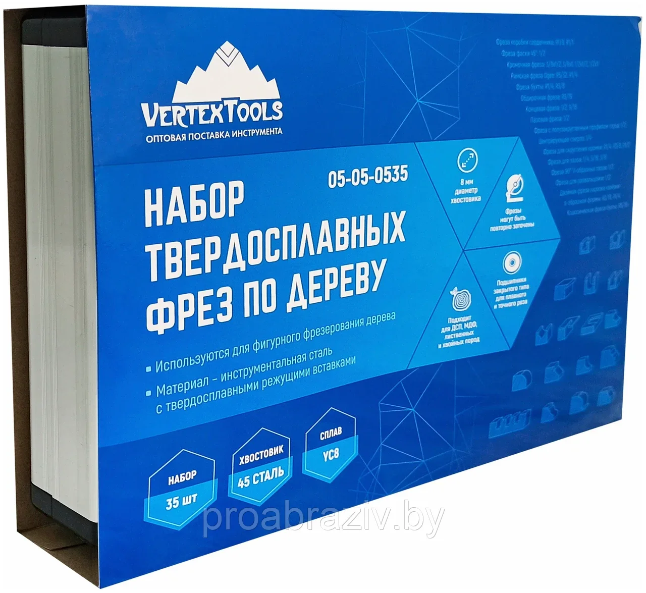 Набор твердосплавных фрез по дереву 35 шт vertextools 05-05-0535 используется для фигурного фрезерования дерева. Подходит для ДСП, МДФ, лиственных и хвойных пород.