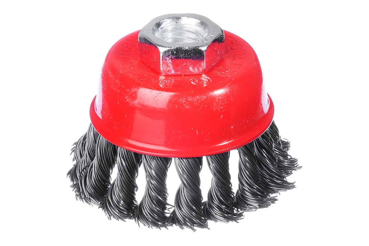 Для изготовления щётки применяется стальная латунированная витая проволока диаметром 0,3 мм. Корпус щётки выполнен в форме чашки методом штамповки из листовой стали. Применяется для щадящей очистки поверхностей и получения заданной шероховатости. Предназначена для обработки больших площадей.
